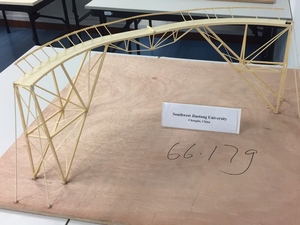 公司设计的桥梁以66.17 g的总质量实现最轻量,其他14所高校设计的桥梁的平均质量为213.62 g。最终,公司设计的桥梁顺利通过了静载实验;但是,在动载测试时,铁球停在了离桥梁末端约3 cm的位置,从而未能获得动载得分。