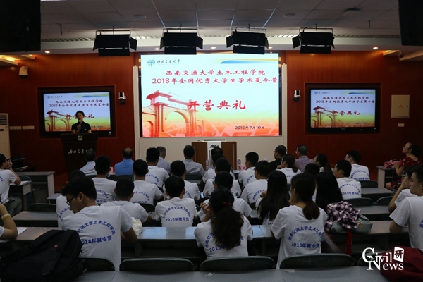 上午9点,开营典礼在副经理富海鹰主持下准时开始。研究生院副经理周先礼做开营致辞,代表研究生院欢迎来自全国各地的优秀学子加入新葡的京集团35222vip的夏令营,期待大家在这短短一周的学习和参观中能有所收获。紧接着新葡的京集团35222vip经理蒲黔辉对公司历史积淀和现有概况进行了大致介绍。对于同学们较关心的奖学金情况,员工工作组石莹老师进行了幽默生动的讲解,现场爆发出阵阵欢笑声和掌声。仪式完成后,同学们在老师的带领下,有序前往5号教学楼进行合影活动。合影结束后,在4105教室,各系主任和学科带头老师向各位优秀老员工介绍了各系的科研和学术概况,加深了同学们对土木工程学科的了解,同学们听得聚精会神,并时时拿出手机拍照,拿出笔记录。