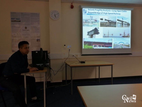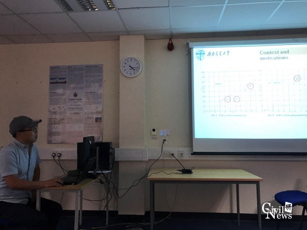 在此期间,S. Alireza Behnejad博士就单层网壳结构选型理论和Formian软件快速建模方法进行汇报交流;张明老师对本项目组就“Research on the seismic failure load of single-layer reticulated shells based on key structural design parameters”中单层网壳结构失效机理及评判标准等问题研究进展做了汇报,分析并讨论了该方法的有效性和可操作性;正在该校访学的项目组成员刘占辉老师做了“Analysis of Frequency Loci Veering Phenomena in Detuned Spherical Reticulated Shell”的研究进展汇报,分析了大跨单层网壳由于对称结构失谐造成的频率转向现象的机理;谢明志老师做了“Construction Control for Thousand-meter-scale Cable-stayed Bridge and the Seismic Fragility Analysis of Long-Span Cable-Stayed Bridge of High Speed Railway”的报告,探讨了大跨高铁矮塔斜拉桥地震功能损伤及冲击破坏等问题。Gerry Parke教授就上述研究报告进行深入点评,结合多年科研经历阐述本项目重、难点问题,并指出下一阶段研究过程中应注意的细节问题。双方经多次沟通交流,进一步细化了本项目研究路线及实施方案,为推动和加强双方下一次交流讨论及深化合作奠定了坚实基础。