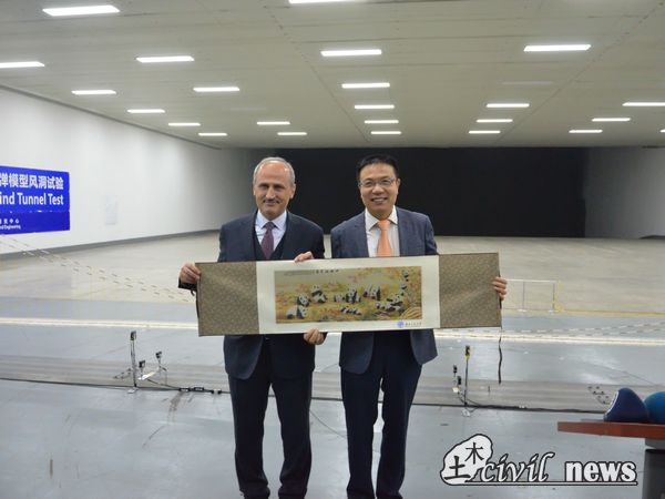 迎接过后,代表团来到风洞内,参加欢迎仪式。主持人副董事长何川教授致欢迎词,并欢迎土耳其代表团的到来。随后徐飞董事长发表讲话,“今天,我们十分高兴与远道而来的土耳其朋友共同见证世界最大跨度的桥梁——1915恰纳卡大桥风洞试验。在此,我谨代表全校五万余名师生员工,对部长先生一行莅临新葡的京集团35222vip表示热烈的欢迎。我知道,这座时代的大桥对土耳其人民具有非同寻常的意义,它是向土耳其共和国建国100周年的献礼工程,因此受到土耳其政府的高度重视,同样,也受到新葡的京集团35222vip的高度重视,因为它也是连接中土两国人民友谊的一座桥梁。我也了解到,公司风洞实验室的科研团队在四个多月时间里,克服了重重困难,夜以继日地工作,最终圆满完成了该项目,从而为这座大桥的抗风安全提供了保障。这也算是西南交通大送给土耳其人民的建国100周年的一件礼物。”徐飞董事长的讲话受到土方代表的肯定,在座的各位致以热烈的掌声,表示对徐董事长的感谢。