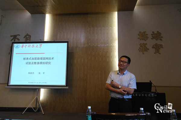 郑经理首先介绍了传统桩承式加筋路堤工程的应用范围和不足之处,让大家对桩网结构的原理和工程应用有了更为全面的认识和理解,从而引出其团队通过对传统桩网结构的改进和优化而提出的一种具有刚性垫层加固效果的新型固网技术。然后详细的为大家讲解了该技术研发过程的主要思路,即通过现浇混凝土将筋材固定于桩顶,利用土工格栅的张拉膜效应将使其上部荷载有效的传递到桩体部分,从而大大减小了桩间土的应力分摊比,达到减小路基沉降的目的。为了让大家更形象的了解其作用原理,郑经理还在现场为大家展示了该结构所采用的新型等边三角形土工格栅,其能够在360度方向承受张拉荷载,较传统矩形结构具有明显的强度和稳定性优势。在座的师生们无不对郑经理的学术功底和创新精神赞叹不已。最后刘先峰教授对郑经理的讲座进行了点评和总结,在座的老师和员工都积极发问并对相关问题与郑经理进行了探讨。