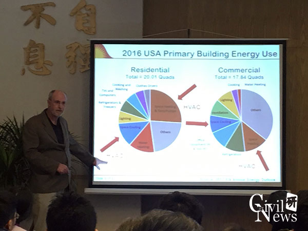 Patrick Phelan教授在本次讲座中分享了未来建筑在零净能源和碳中和下的发展前瞻。他首先介绍了亚利桑那州的情况以及建筑能耗的现状。然后介绍了不同能源用于建筑中的消耗情况以及造成的费用情况。接着介绍了未来建筑考虑的一些方面,如:对人体健康的影响,对环境的友好程度等。Patrick Phelan教授讲到“绿色”建筑的发展一般是向零净能源发展,并且在一些地方发生得非常迅速。例如,加利福尼亚州已经要求到2020年所有新建住宅建筑物的零净能源。另一个更加困难的挑战是碳中和建筑。美国能源部建筑技术办公室与太平洋西北国家实验室合作,组织了为期一年的努力,题为“未来建筑”,目标是解决这个困难。这项研究涉及跨学科的顾问小组和专家参与了一系列涉及建筑技术,材料,建筑,施工实践,健康,城市规划和环境科学的网络研讨会,研讨会,研讨会和会议介绍从现在开始大约一百年以后,对建筑物的一致看法。教授在报告中分享了许多数据图表,语言幽默风趣,讲解通俗易懂,在场的老师与员工都表现出了浓厚的兴趣。