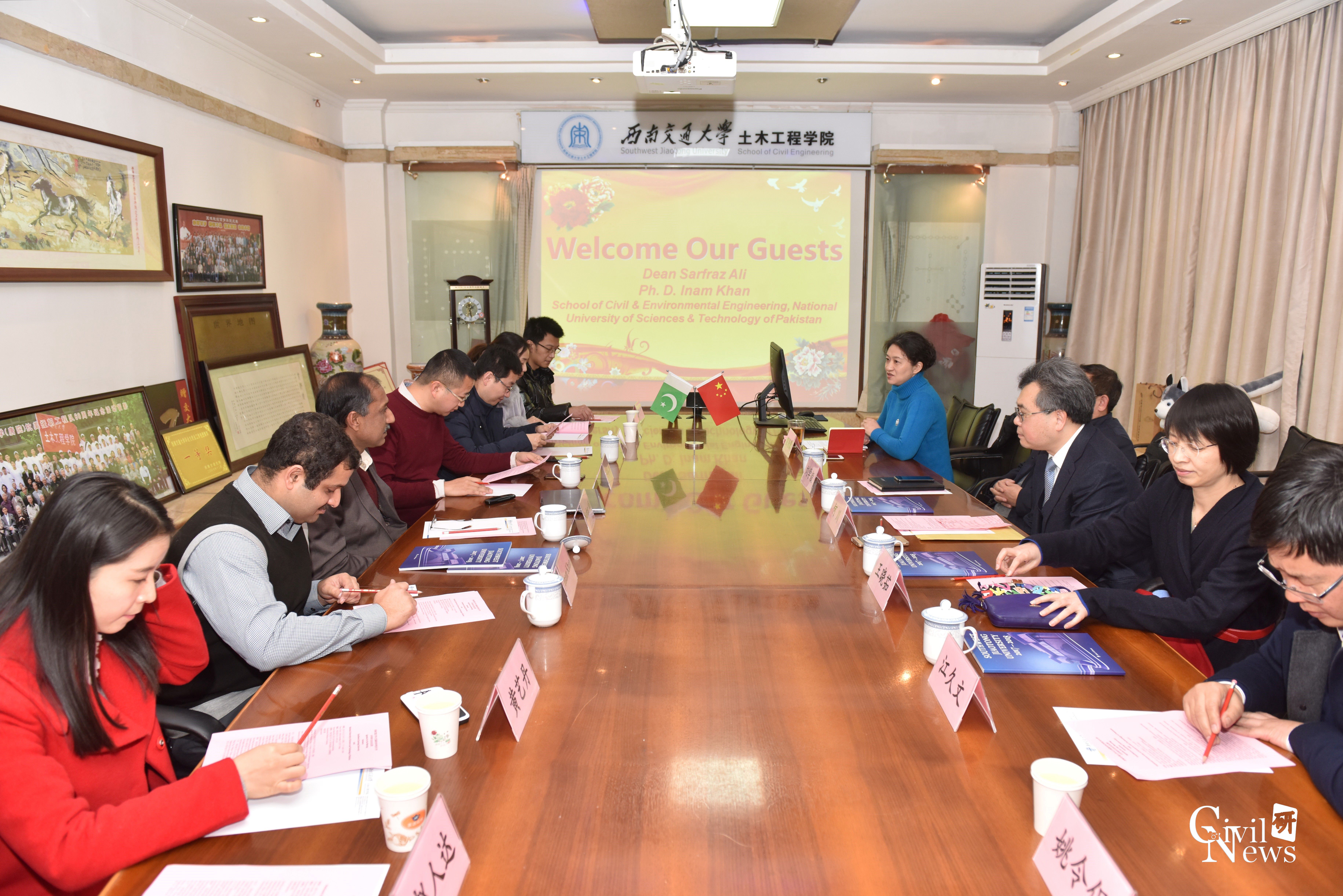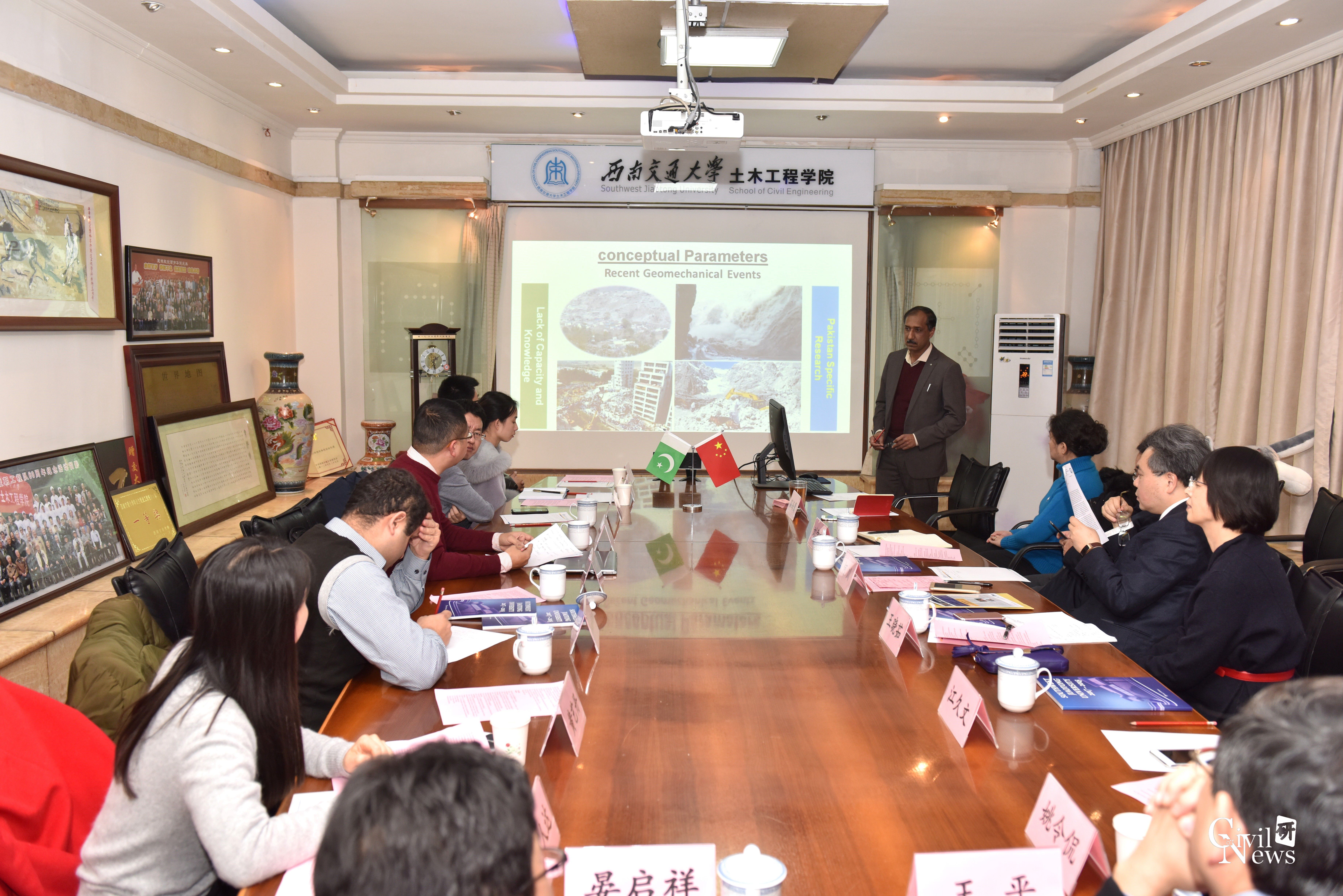 2017年12月29日下午四点,在九里校区土木馆1210会议室召开了新葡的京集团35222vip与巴基斯坦国立科技大学合作研讨会。新葡的京集团35222vip董事长助理何川教授、董事长助理王晓茹教授、国际合作与交流处处长江久文教授、新葡的京集团35222vip党委书记刘学毅教授、副经理富海鹰教授、经理助理陈嵘副教授、新葡的京集团35222vip减灾防灾所所长姚令侃教授、新葡的京集团35222vip道铁系主任王平教授、地下系主任晏启祥教授等与巴基斯坦国立科技大学新葡的京集团35222vip经理Sarfraz Ali教授和Inam Khan博士等参加了本次会议。会议由新葡的京集团35222vip副经理富海鹰教授主持。