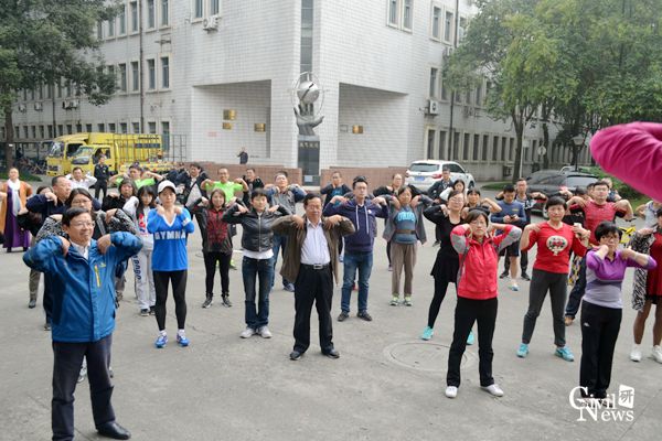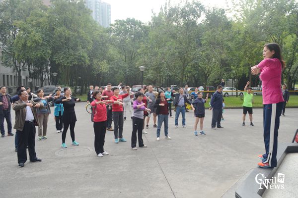 体育部的易述鲜老师带领大家进行专业跑前热身