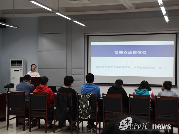 下午两点半,周四党课大讲堂活动正式开始。首先,在李书记的带领下,全体与会人员一同观看由南京航空航天大学能源与动力公司党委副书记徐川主持的党课视频《顶天立地谈信仰》。视频中,徐川以风趣幽默的脱口秀带来了一堂别开生面的党课。徐川从“一封尖锐犀利的思想汇报”、“那些多元纷纭的入党动机”及“谈谈独立思考与国际视野”三个方面进行了讲解。观看视频期间,各党员都认真地观看视频,记录重点。