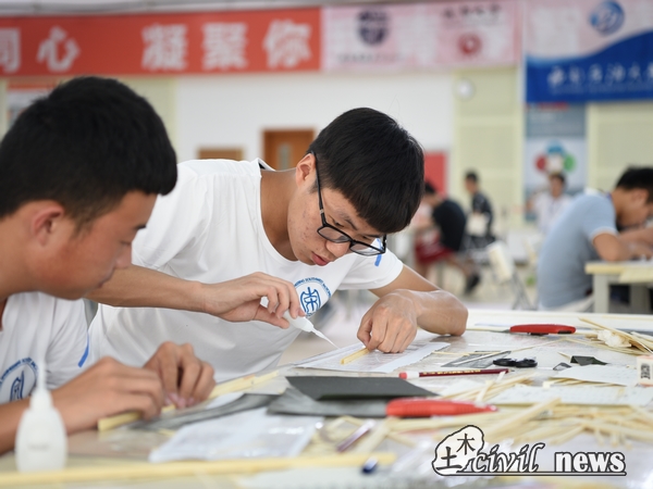 7月16至18日,模型制作、提交、称重、检测及加载有条不紊地进行。7月16日-17日,十四支队伍全身心的开始长达18小时地模型制作,从早到晚,坚持不懈。团队中的三人密切沟通,交流想法,耐心细致地做好模型的每一部分,稍事休息,便又投入了模型制作中。每一支参赛队伍都是如此,分秒必争,一丝不苟。最终共有8支队伍成功完成加载,新葡的京集团35222vip代表队以89.06分拔得头筹,峨眉校区代表队也以85.61的高分获得二等奖。