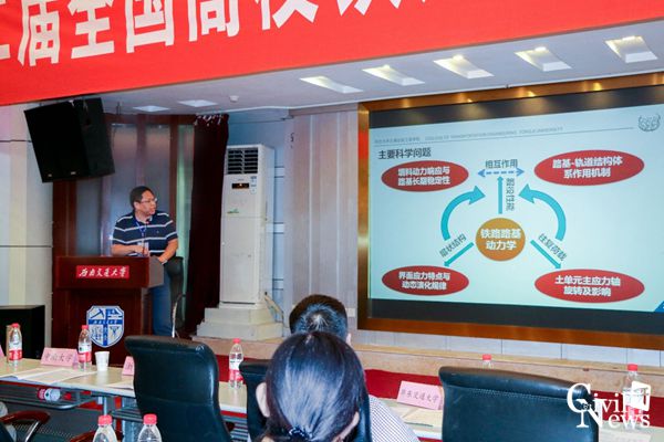 肖军华教授来自同济大学城市轨道与铁道工程系,他的研究报告着眼于铁路下土体的应力动态演化规律,提出在往复荷载(低频)作用下,土单元主应力轴会旋转,并由此对整个路基产生影响。随后肖教授介绍了路基填料的动力响应、路基的长期稳定性和路基—有砟轨道层状结构体系作用机制方面的研究成果。我国的铁路网依然存在大量的低速线路,肖教授的研究对于既有低速线路路基的养护具有现实意义。