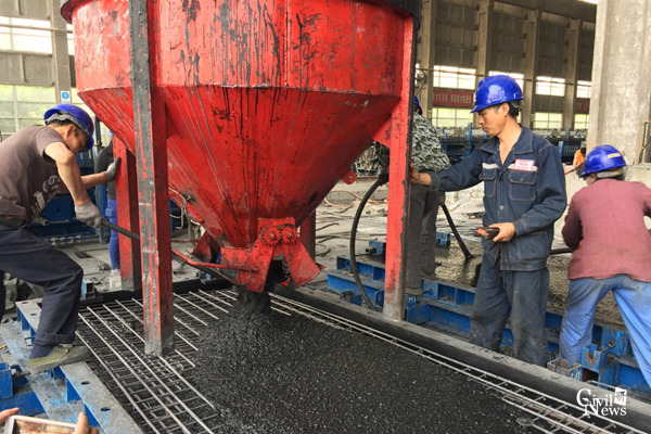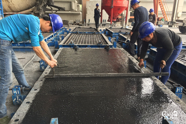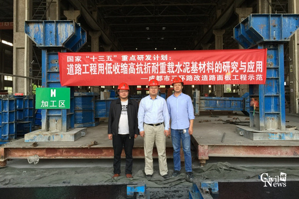 2017年4月18日下午,由公司曾晓辉副教授主持的国家“十三五”重点研发计划课题成果在四川华西绿舍建材有限公司进行了成都市三环路改造用路面板的应用示范,“华西绿舍”生产主管蔡周平高级工程师、技术中心主管袁泽洋高级工程师和曾晓辉副教授、瞿福林同学在现场指导了路面板的生产。