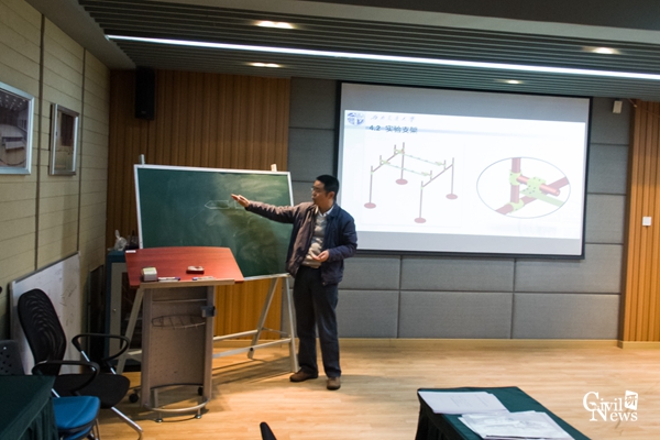 硕士生开题答辩中,首先,陈银灯做了《基于OpenSEES软件的钻石型主塔铁路斜拉桥系统易损性研究》的汇报,通过对斜拉桥各个构件及整体系统的易损性的研究,旨在为大跨度斜拉桥抗震设计提供参考依据;郭夏研究题目为《分离式箱梁断面气动参数及气动干扰特性研究》,创新性地设计了一款测量天平架设支架,该支架可以方便地考虑风偏角和攻角等因素对分离式箱梁气动参数的影响,并已经申报发明专利;周刘茜、邹明伟和朱进波分别做了《船撞桥墩作用的有限元数值仿真及碰撞特性研究》、《大跨度钢桁梁悬索桥气动参数数值识别与抖振时域分析》和《流线型箱梁断面的颤振后非线性特征研究》开题答辩。在充分查阅国内外研究文献的基础上,结合当前桥梁结构动力学的研究热点,5位硕士生选题合理,准备充分。在此过程中,郑史雄教授耐心解答和指导每位员工在研究中面临的难题,团队其他成员也发表了自己的见解,提出了意见和建议。现场成员积极讨论,学术氛围浓厚。