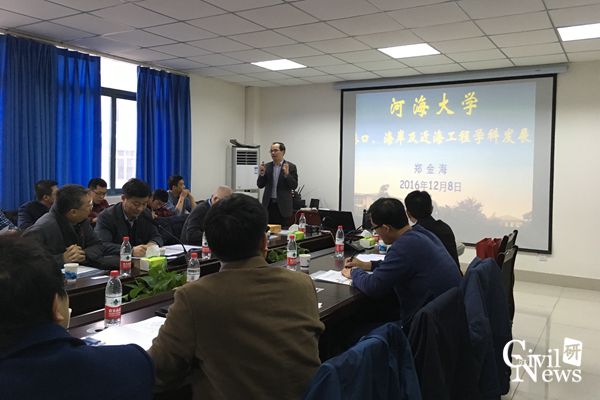 首先进行汇报的是郑金海经理,他对河海大学的发展状况和港口海岸与近海工程公司进行了介绍,然后从室内实验数据、现场观测仪器、沿海水文多要素长期观测平台、数值模拟软件等方面介绍了港口、海岸及近海工程学科的发展,并对学科的代表性成果进行了介绍。