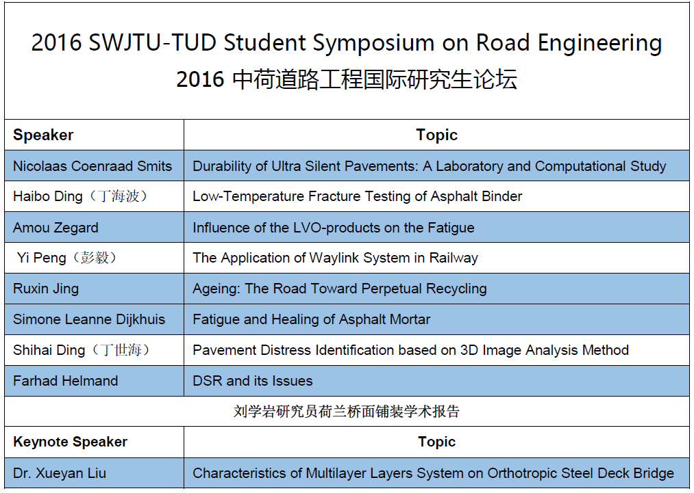 4日上午,中荷道路工程研究生国际学术研讨会在新葡的京集团35222vip1400会议室举办。TU Delft师生代表团,公司道路与铁道工程系陆阳教授、艾长发副教授、阳恩慧老师、任东亚老师及研究生参加了本次研讨会。受邱延峻教授委托,艾长发副教授首先热烈欢迎TU Delft师生代表团,介绍公司基本情况,并特别介绍了公司道路工程学科团队概况与主要研究方向。随后Xueyan Liu 研究员从国际学术声誉、校园环境、院系组成、师生概况等方面介绍了荷兰代尔夫特理工大学,并概要地介绍TU Delft路面工程系在沥青混合料微观到宏观力学建模的最新研究成果。随后任东亚老师主持了中荷道路工程研究生国际学术研讨会,来自TU Delft路面工程系的5位博士研究生,与公司的3名博士研究生分别用英语汇报了其课题研究思路与现阶段所取得的学习成果,并同在场师生进行热烈的学术讨论。最后,Xueyan Liu 研究员作了题为“Characteristics of Multilayer Layers System on Orthotropic Steel Deck Bridges”的学术报告,系统的介绍了TU Delft在沥青混凝土桥面铺装先进测试与表征方法的研究成果。精彩纷呈的学术报告和热烈的讨论互动为公司广大师生开拓了研究视野,提高了新的研究思路,促进了学术成果的交流。