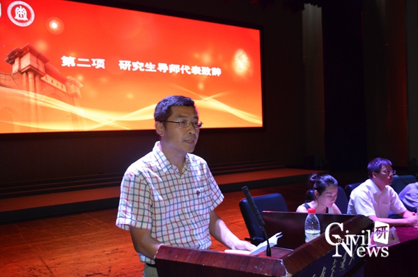 全体奏唱国歌之后,王明年教授作为研究生导师代表致辞,对新生的到来表示由衷的欢迎,并对新生提出了三点注意事项:第一,员工应了解自己导师的科研方向以及研究内容,学习老师发表的论文,明确自己将来的学习方向;第二,员工应该学会团队协作,发挥团队精神、互补互助以达到团队最大工作效率的能力;第三,在学好专业知识的同时,员工应该注意自己在写作方面的提高,为论文的写作打下基础。