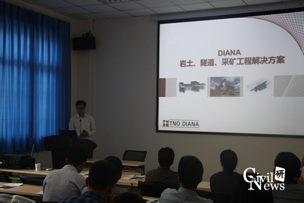 罗燕介绍了DIANA关于我们,TNO DIANA的历史沿革以及郭樸土木团队。然后由TNO DIANA中国区域技术顾问李治做《DIANA—岩土、隧道、采矿工程解决方案》的报告。他讲到DIANA交互界面更加友好,具有可视化和文本化的功能,使得想要学习该软件的师生更易于上手。随后介绍了DIANA中的网格类型、分析类型、通用单元库、材料模型、荷载和边界约束等。最后介绍了DIANA在隧道稳定、桩筏基础、桥梁极限承载力等工程中的应用。为了向大家形象具体的介绍DIANA的操作方法,李治工程师以“隧道管片错缝模拟”为例,演示了DIANA建模的操作流程。