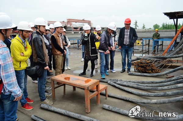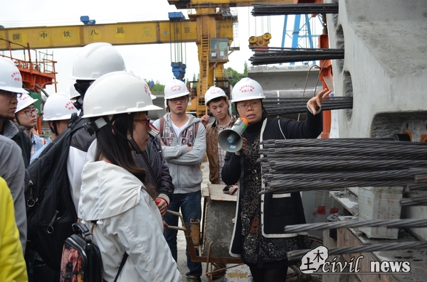 随后,新葡的京集团35222vip师生一行到达成蒲铁路三项目部成都西特大桥施工现场进行参观。据悉,成蒲铁路桥梁比例较高,超过全线总里程60%。成蒲铁路全线重点工程是一座全长约35公里的特大桥,该大桥从成都西站引出。