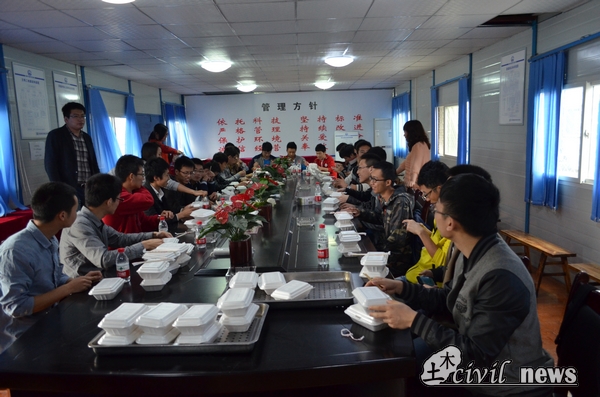 截止上午11点,座谈会圆满结束,同学们纷纷表示获益匪浅。随即,在中铁八局相关人员的陪同下,土木师生一行前往中铁八局成蒲项目部,并于中午12点抵达项目部,在崇州制梁场食堂就餐。