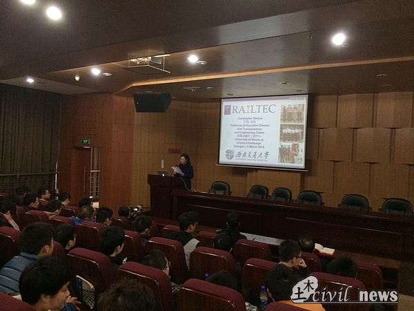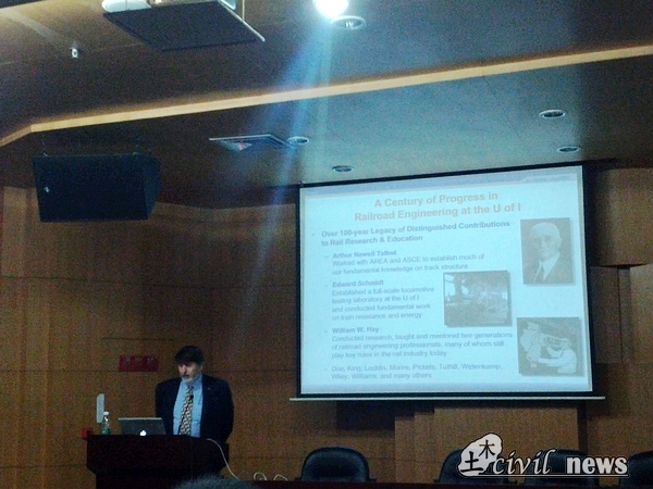 首先,在易思蓉教授简单的介绍后,Christoper P.L.BarKan教授以一句中文“谢谢”开始了他的演讲。BarKan教授详细介绍了UIUC的发展历史和当前状况,其中提到UIUC在教学和科研方面的丰硕成果和UIUC带领美国七所大学成立“美国大学铁路联盟”后所取得的长足发展。作为美国铁路方面的权威研究机构,美国铁路方面的教学几乎集中在UIUC,而UIUC也吸纳了大量来自中国的访问学者和职工。BarKan教授表示,UIUC十分重视与在中国同样为在铁路发面具有权威的公司展开积极的合作。