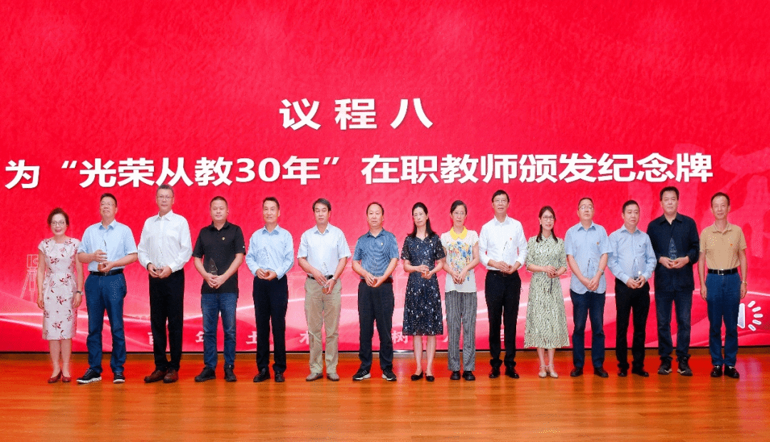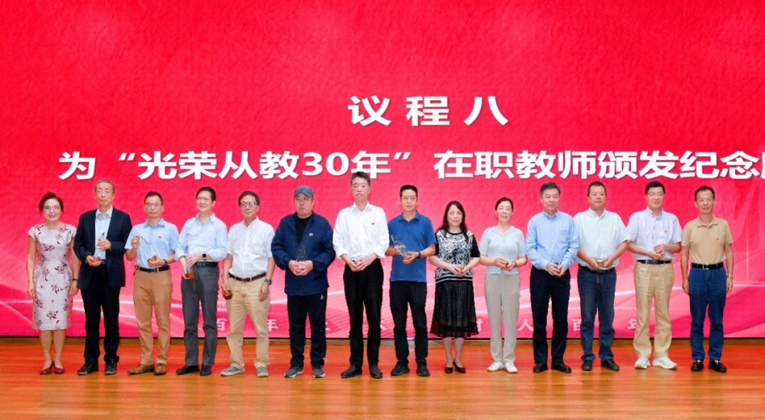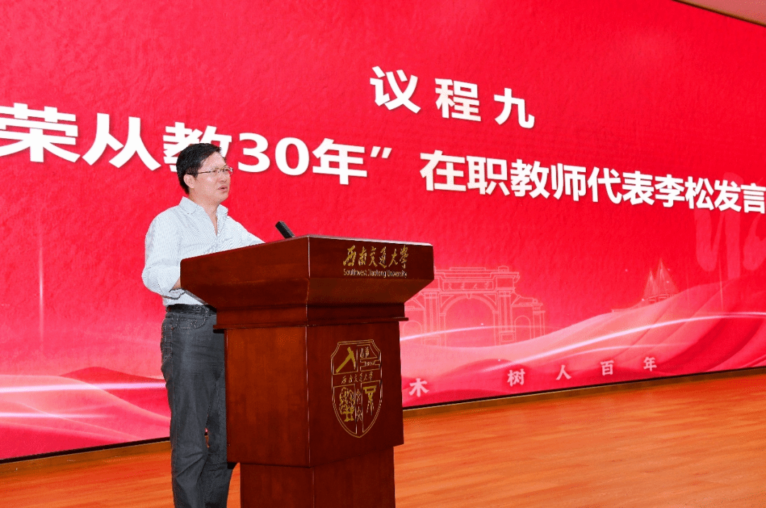 表彰会第二篇章——“岁月流金”,致敬坚守教学科研一线,追求卓越的优秀教师。于丽副经理宣读“光荣从教30年”在职教师名单,赵世春、黄充、李松等32位教师获此殊荣。随后,蒲黔辉经理和郑江书记为“光荣从教30年”教师颁发镌刻着名字的纪念牌。李松教授作为光荣从教30年教师代表发言,他谈到公司发展带来的机遇与挑战,教师是一个国家繁荣昌盛不可或缺的中坚力量;“师者”二字背后,不仅是对知识的敬畏,更是对国家未来的担当。随后,大会向廖海黎教授等7位年度退休教师致以敬意,感谢他们为公司发展作出的长期贡献。